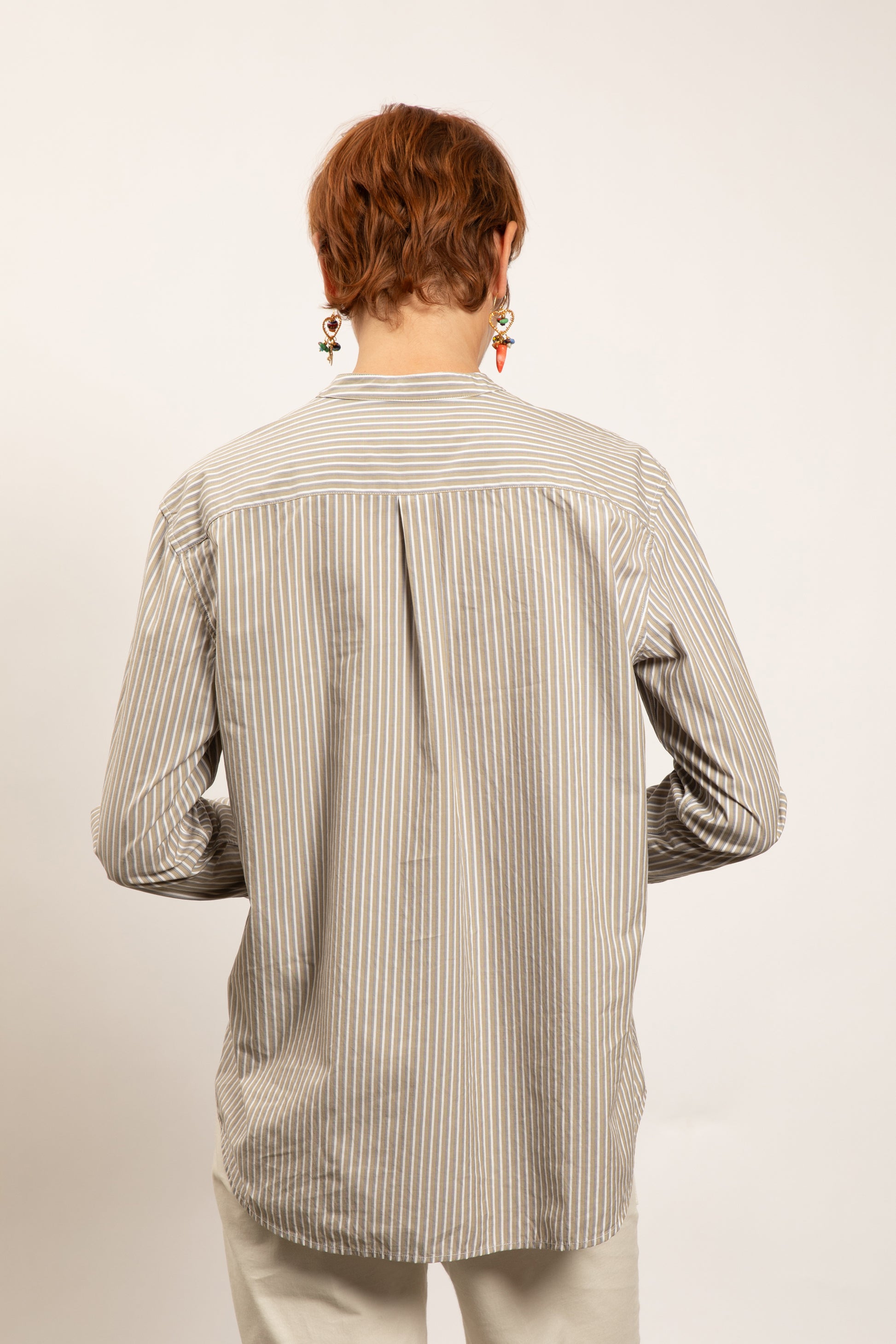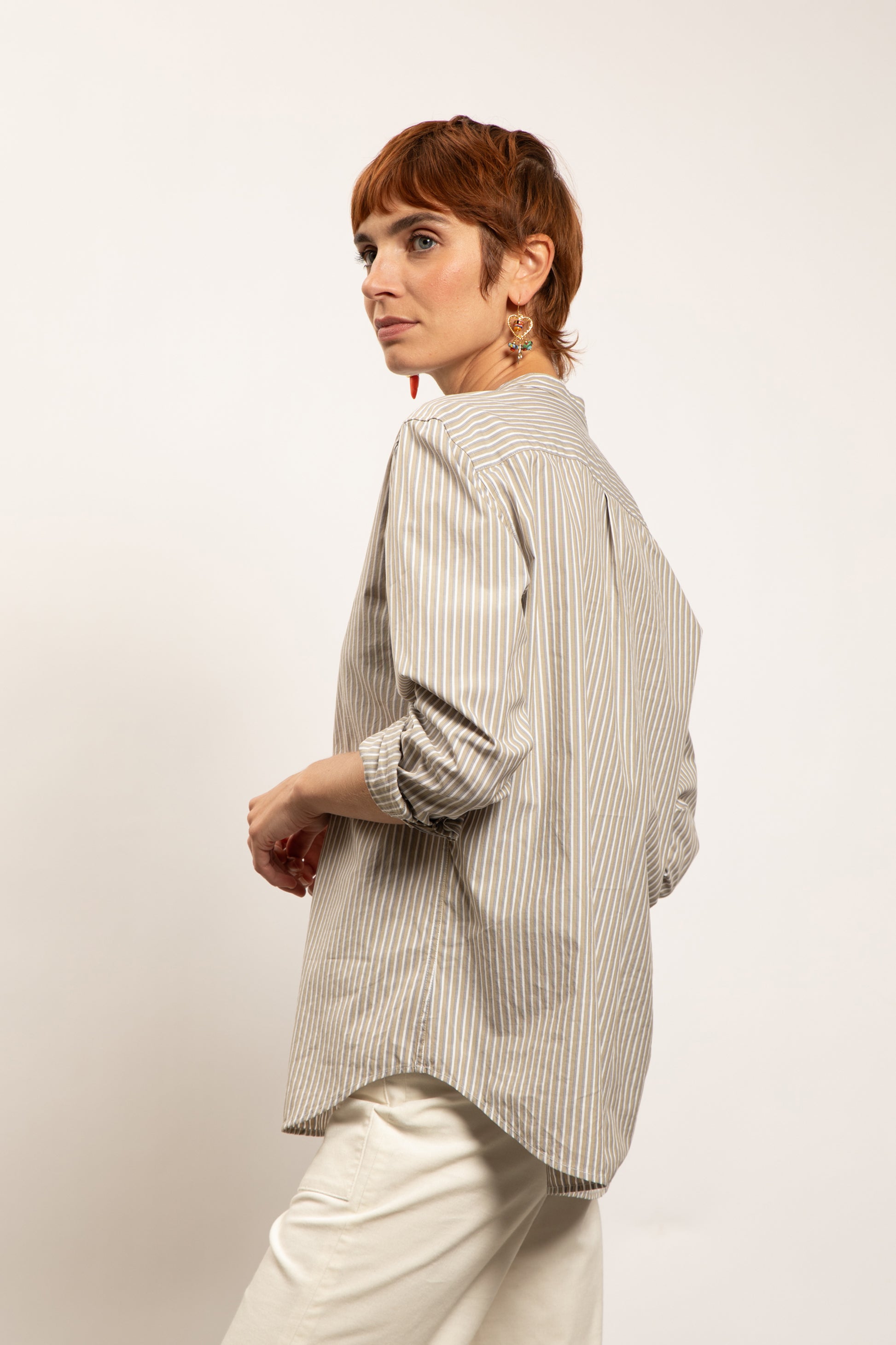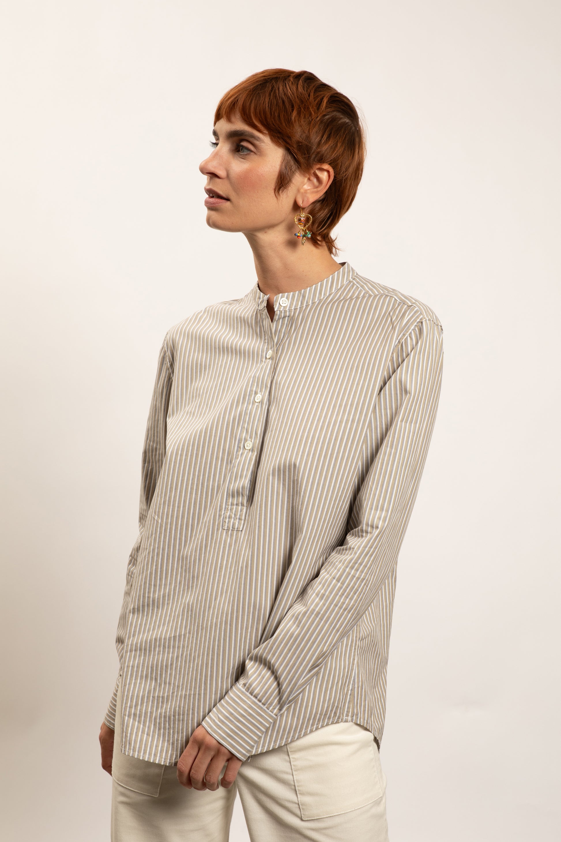Elle n’a plus besoin de carte de visite : voici notre incontournable chemise "Portofino", la chemise polo sans col signée Victoire. Comme pour le reste de nos collections, nous avons l’habitude de choisir nos tissus dans les plus belles maisons italiennes, ici, notre popeline vient de chez Albini, entreprise familiale fondée en 1876.