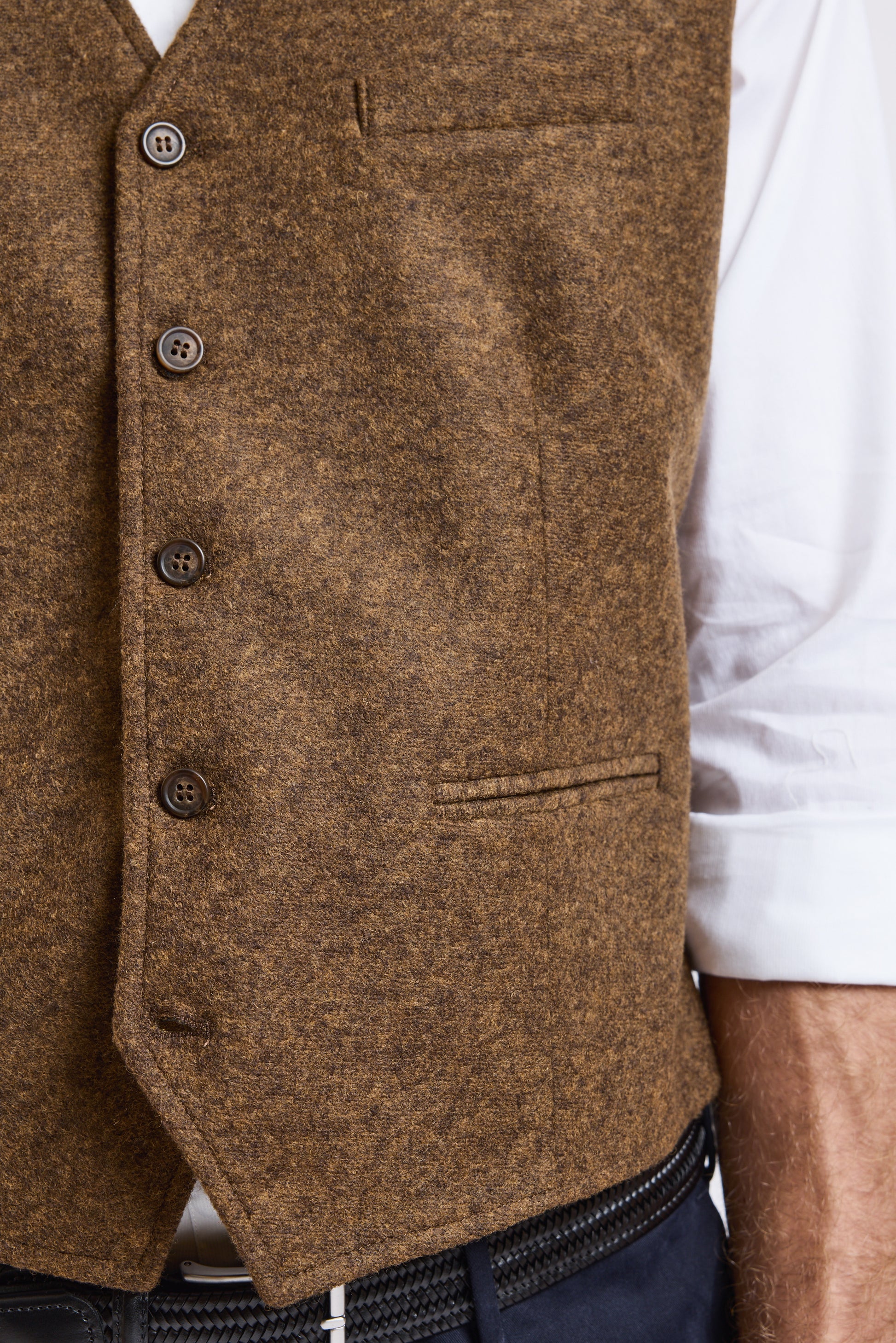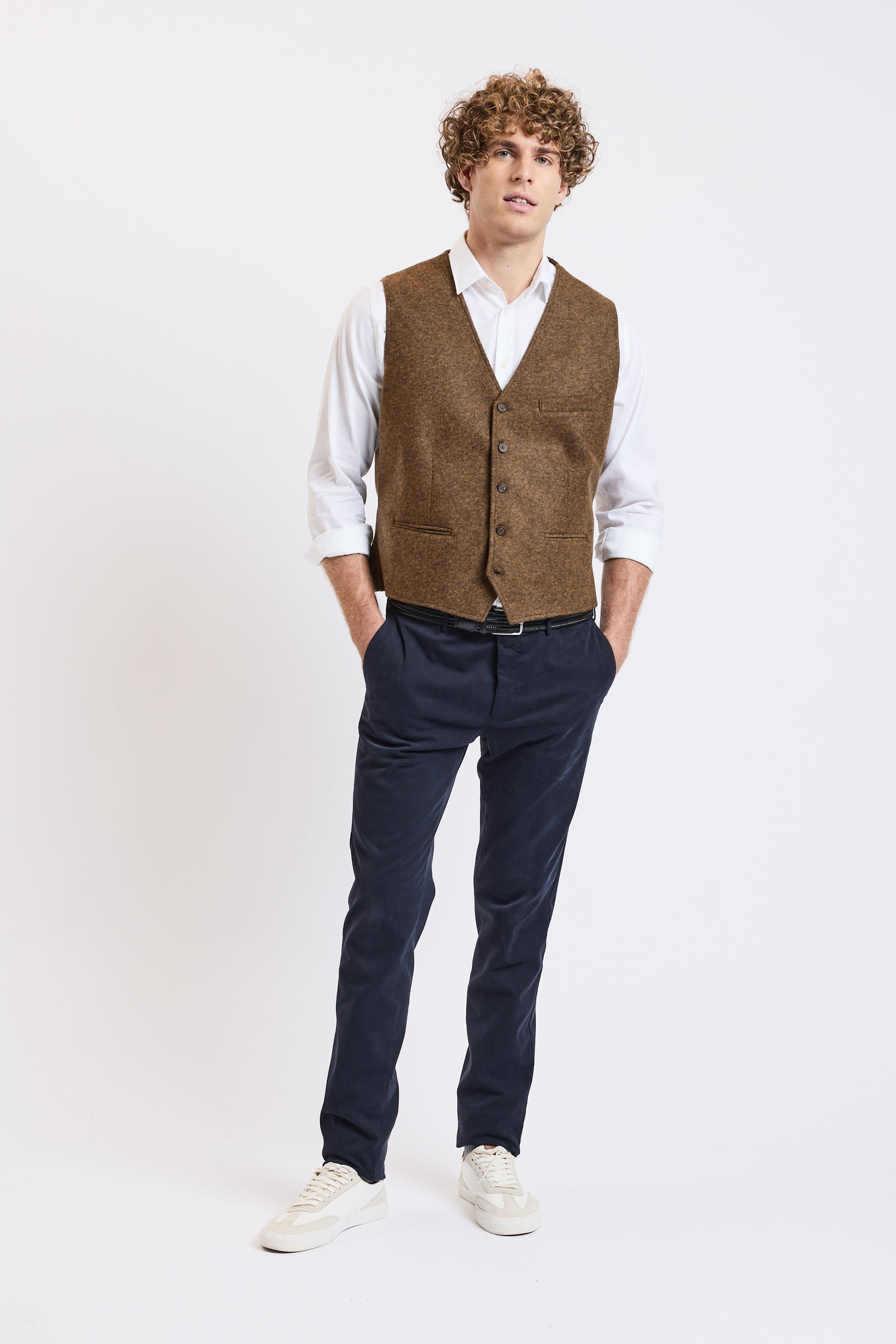 Cette saison, nous accueillons un nouveau chez Victoire, et nous souhaitons la bienvenue à la marque Flear. On adore l'élégance de ce gilet de costume uni. Il a une poche poitrine et deux poches passepoilées. Alexandre mesure 1m91 et porte une taille L. Fabriqué en Italie