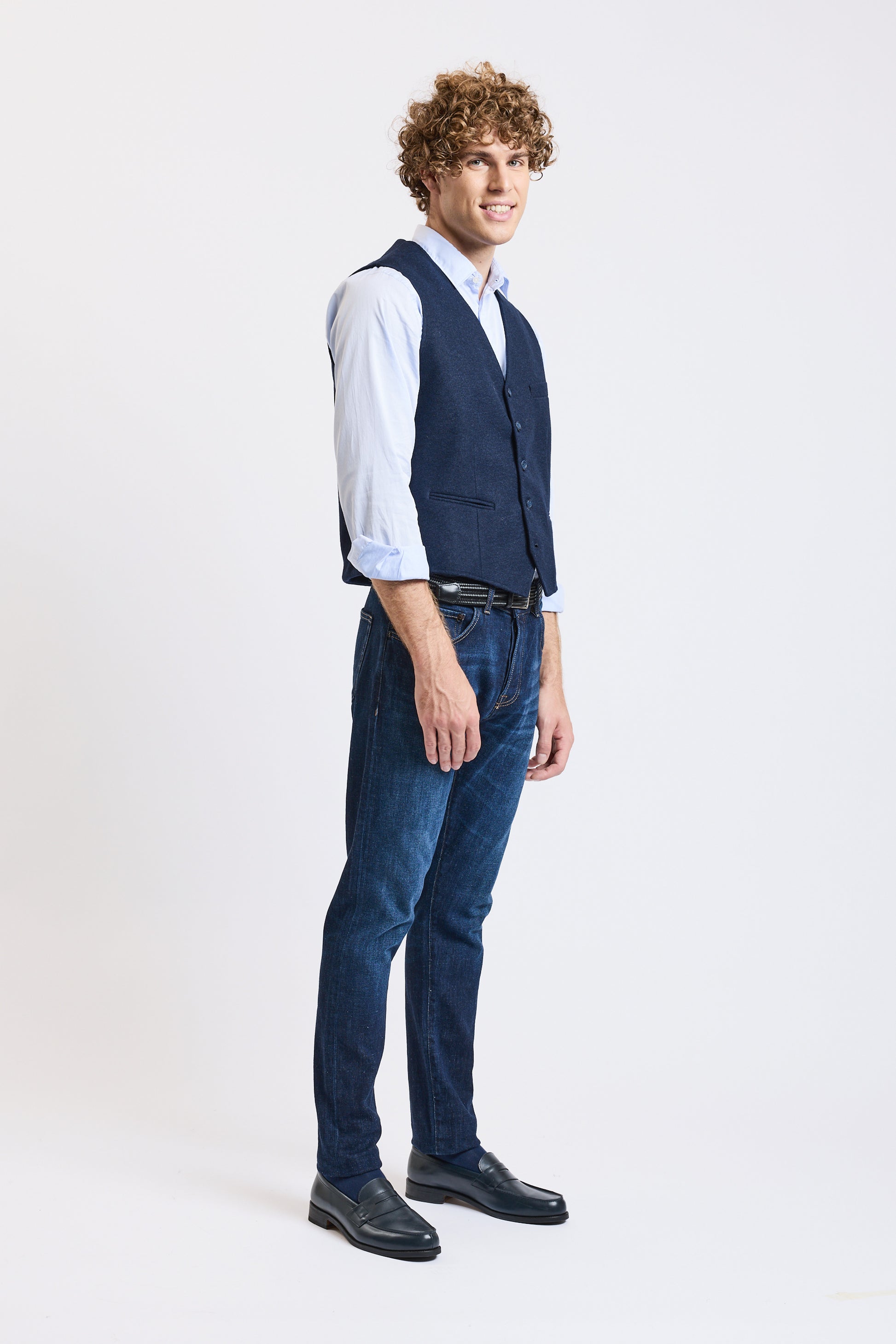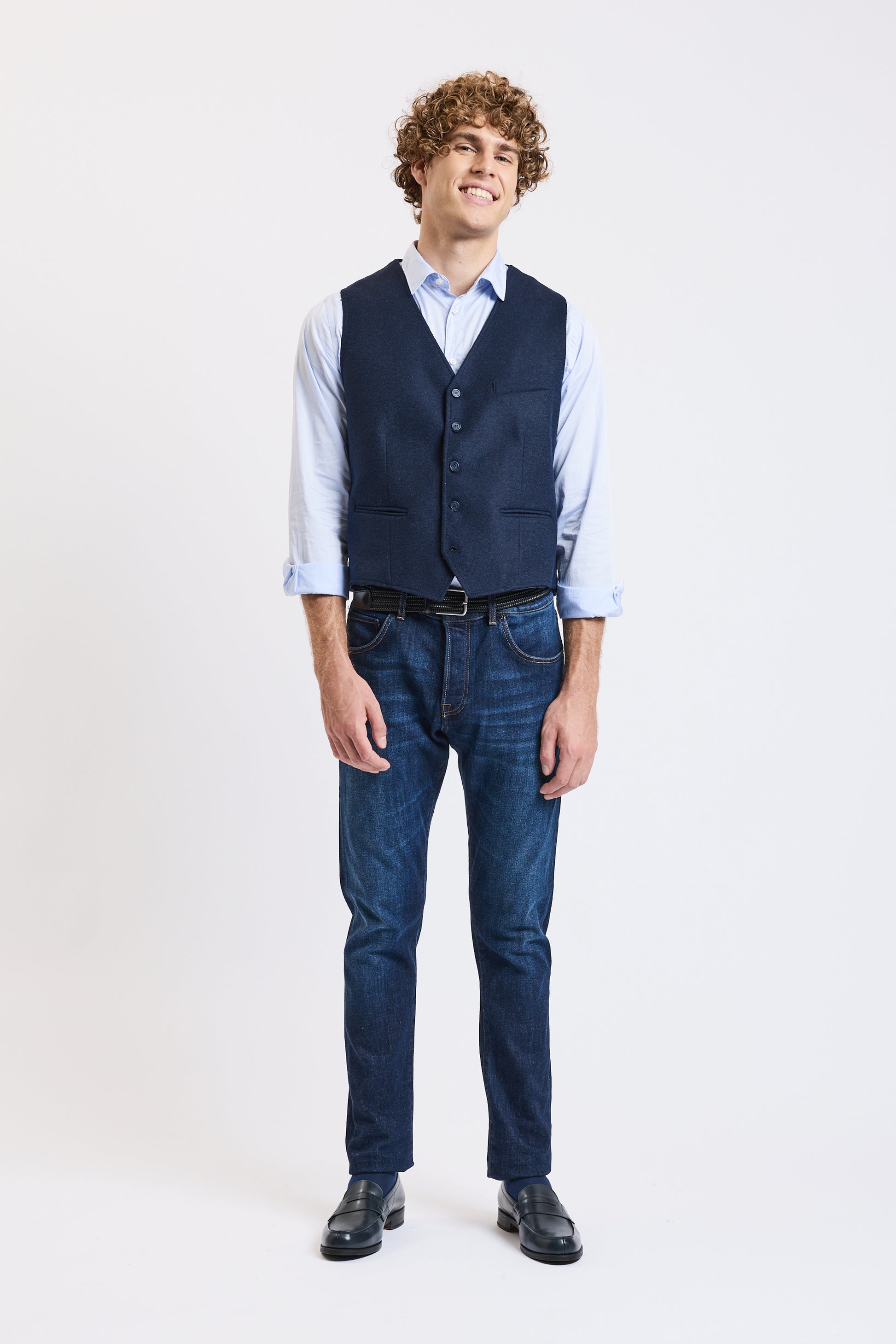 Cette saison, nous accueillons un nouveau chez Victoire, et nous souhaitons la bienvenue à la marque Flear. On adore l'élégance de ce gilet de costume uni. Il a une poche poitrine et deux poches passepoilées. Alexandre mesure 1m91 et porte une taille L. Fabriqué en Italie