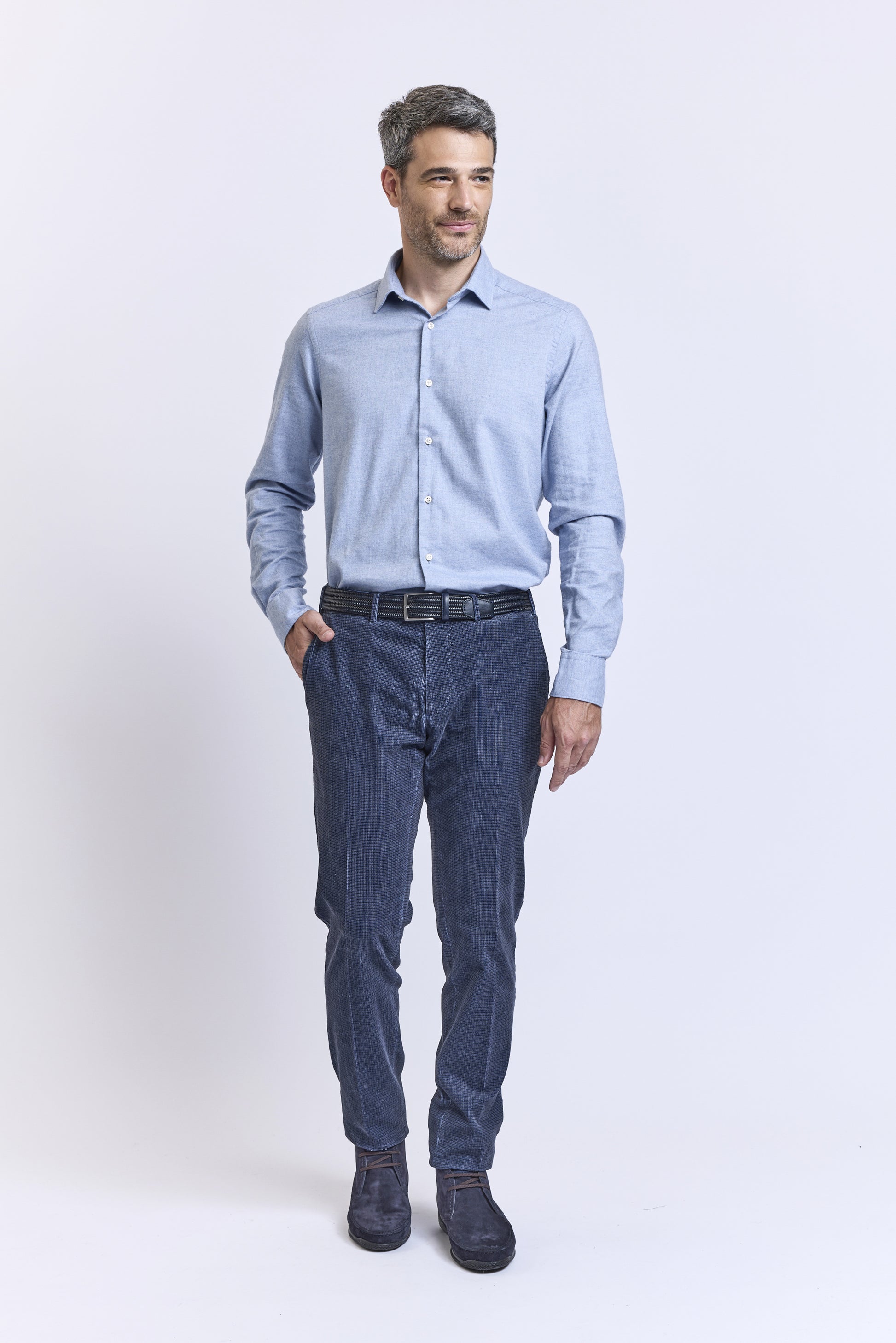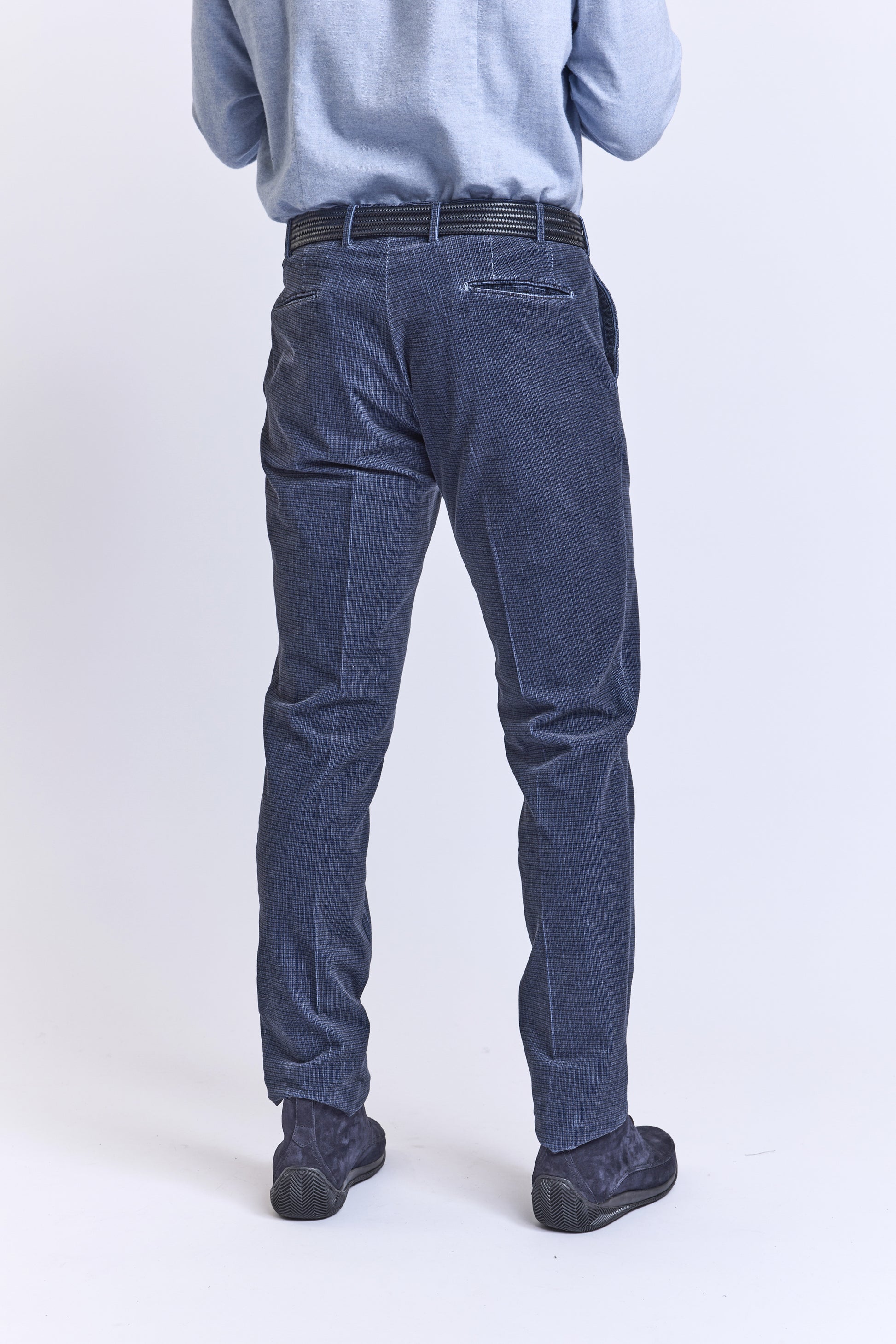 On adore les couleurs de ses pantalons en velours milleraies imprimé minis carreaux. Il a une coupe slim avec trois points de fermeture à la taille et une fermeture à glissière. Il a deux poches italiennes, une poche ticket, et deux poches passepoilées à l’arrière. Mathieu mesure 1m84 et porte une taille 48. Fabriqué en Italie