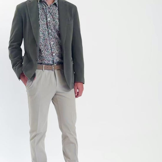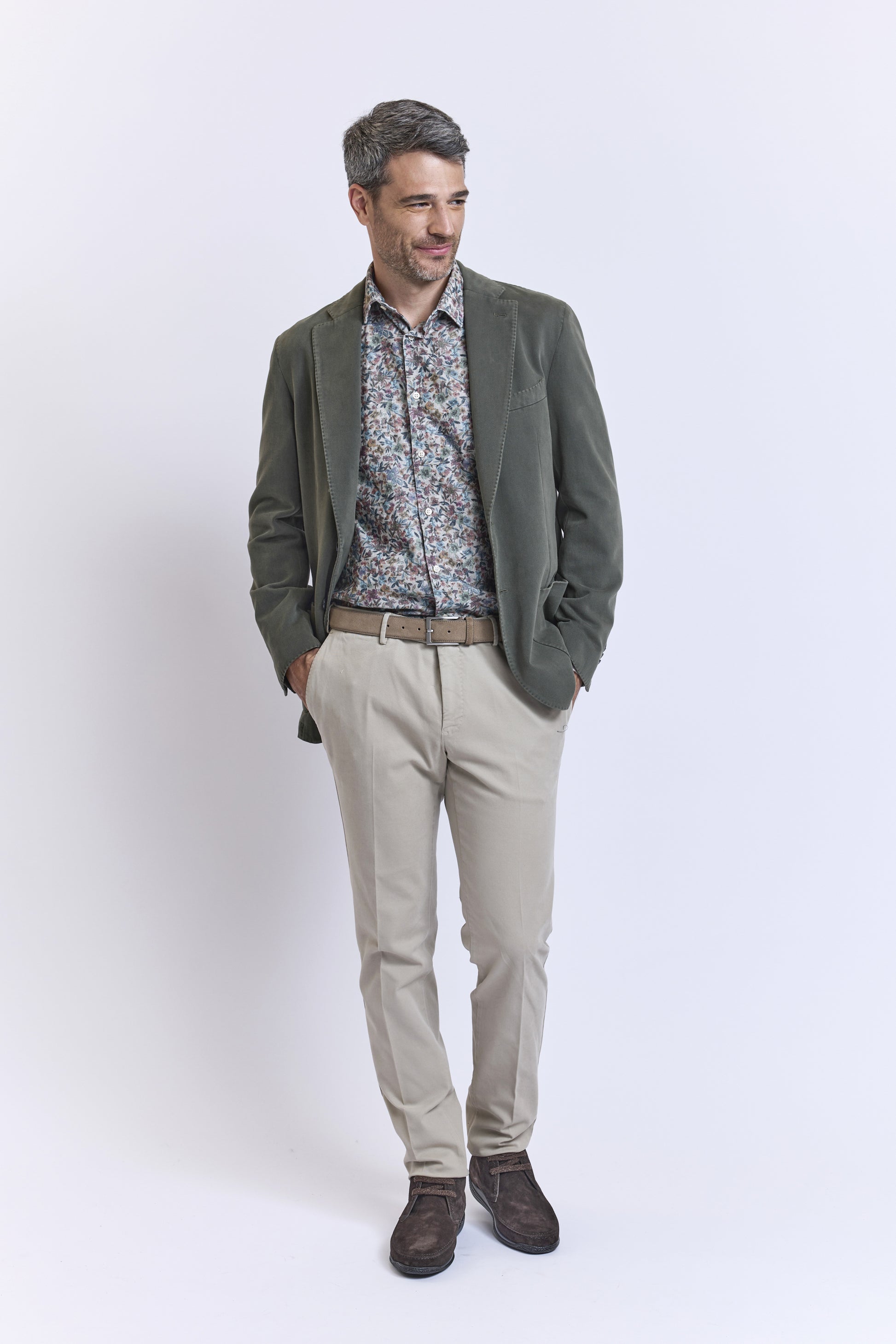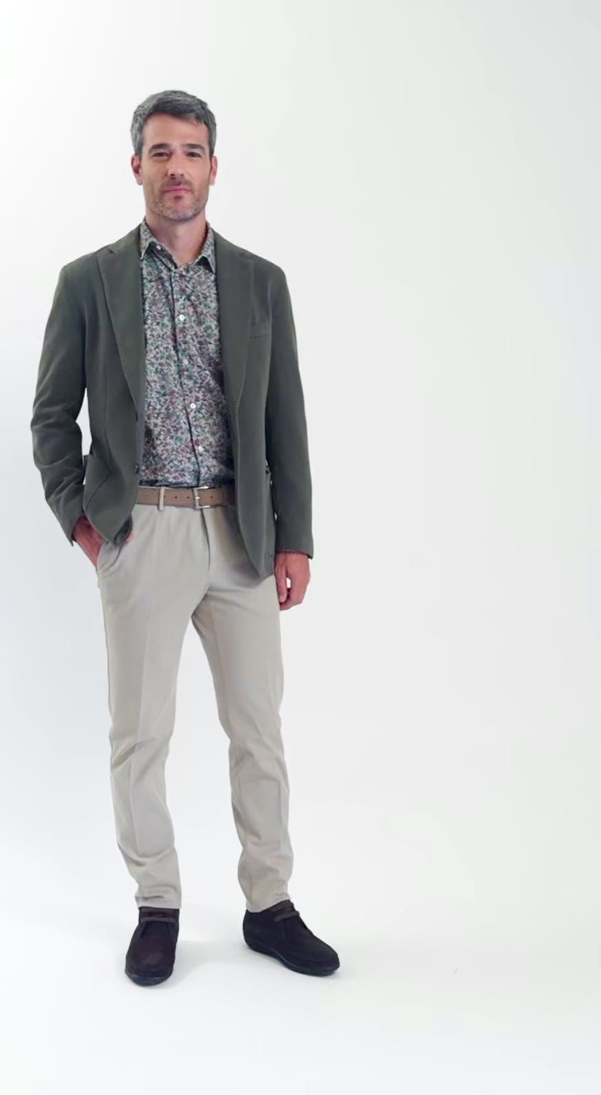 On a craqué pour la douceur de cette veste en coton et cachemire. Celle-ci a une coupe ajustée avec deux fentes à l’arrière, deux poches plaquées, une poche poitrine et une vraie boutonnière au poignet. Deux poches intérieures. Mathieu mesure 1m84 et porte une taille 50.