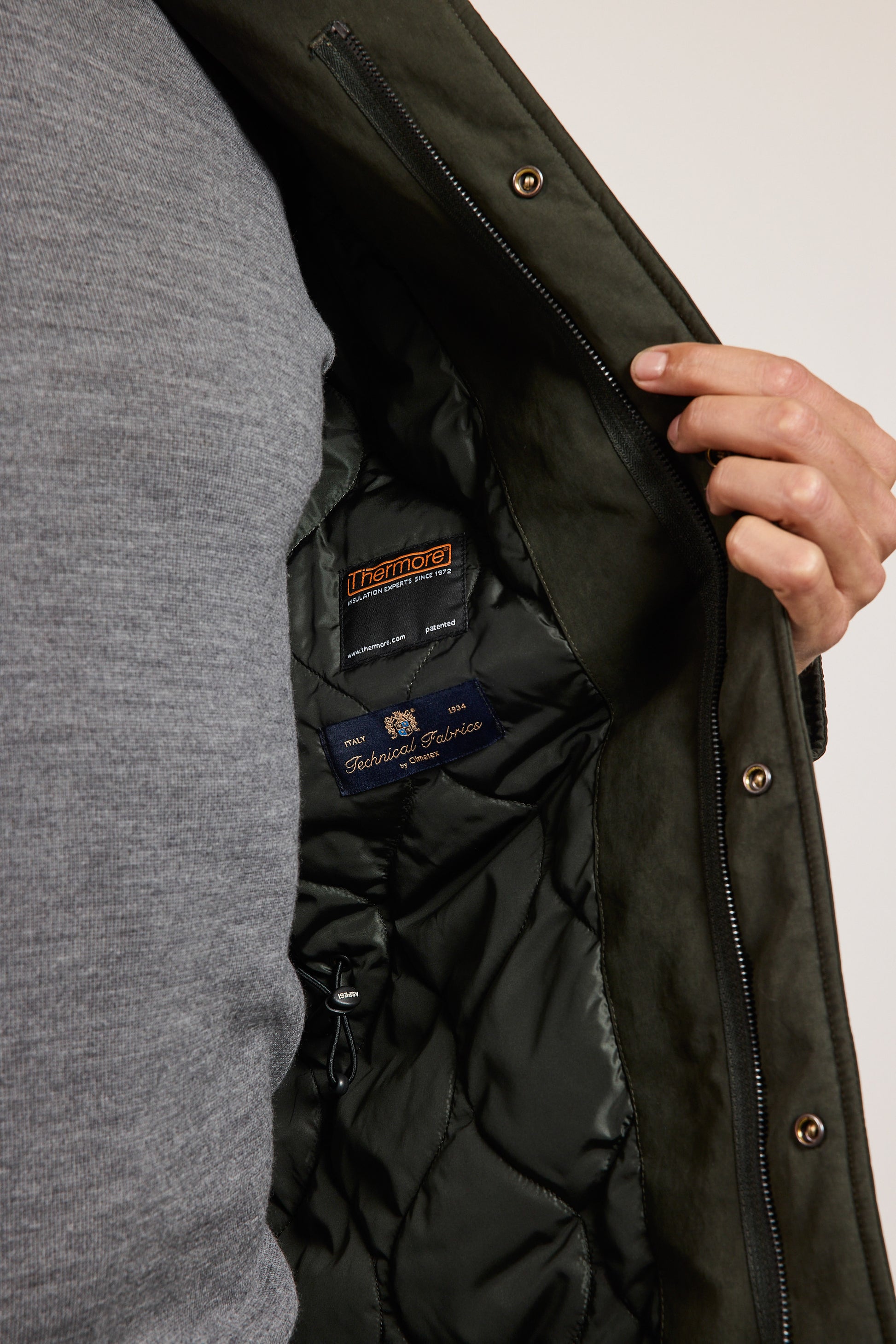- Zip closure with hidden snaps at the front