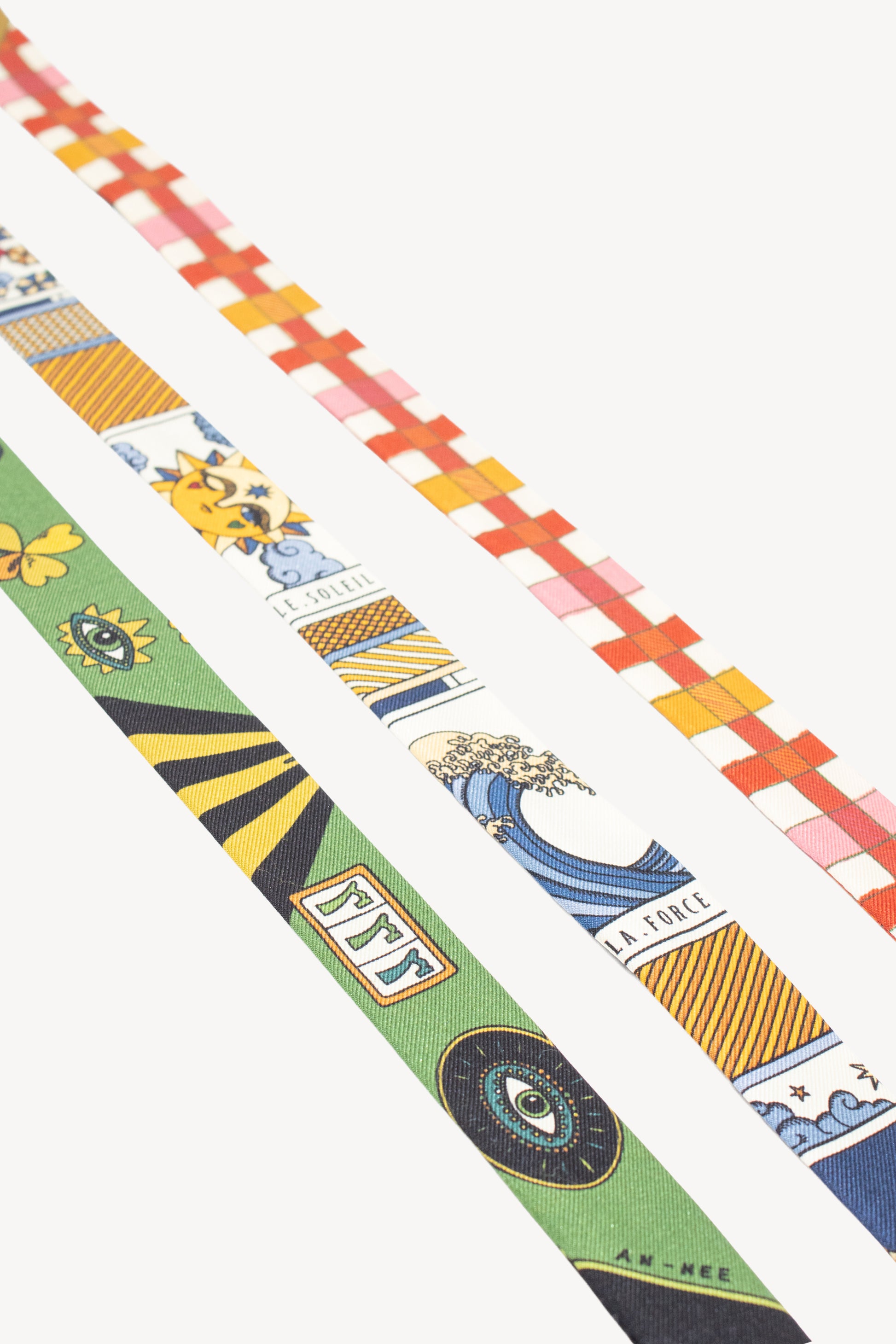 Reinventing the silk scarf with graphic print scarves and customizable costume jewelry thanks to interchangeable silk ribbons, tailored to your desires and looks. Designed with sincerity by Alexa, each print is drawn with a black pen, always figurative, and accompanied by carefully balanced color harmonies.