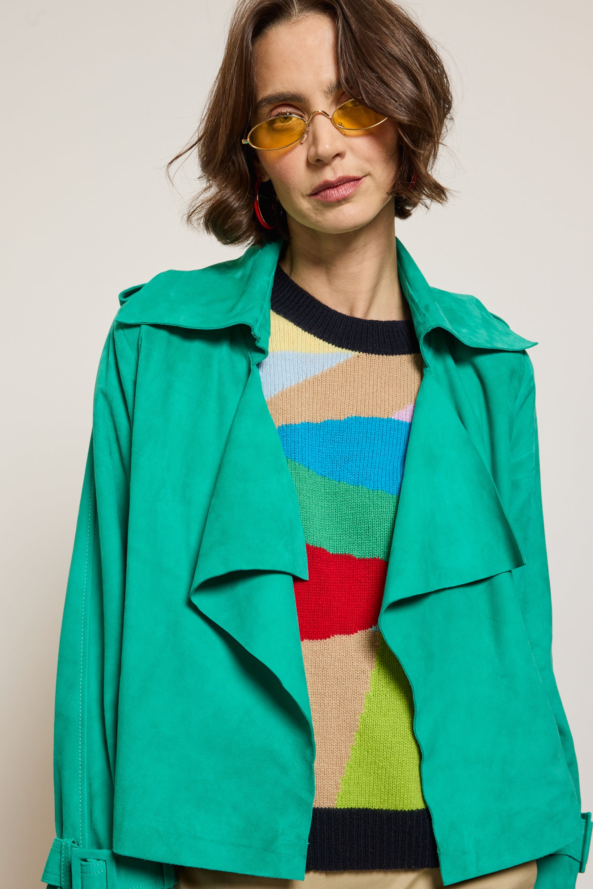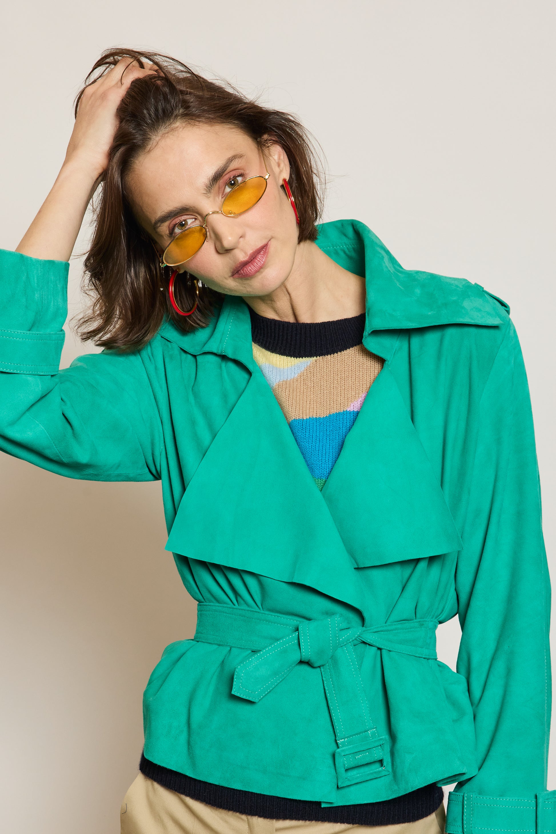 Une veste au vert franc, coupe nette, ceinturée juste comme il faut.